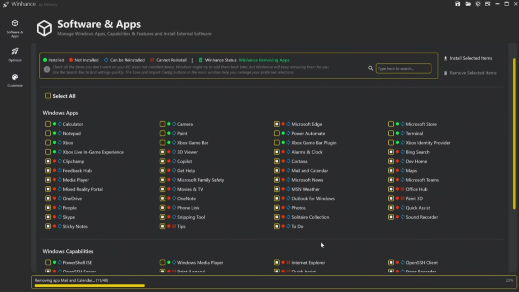 Otro de los más conocidos y usados es Winhance, otra opción muy útil y accesible con muchas opciones de configuración. Usa una interfaz más fácil de usar y, aunque no ofrece la misma profundidad en modificaciones de Windows, permite mucha personalización de las funcionalidades para la mayoría de usuarios.